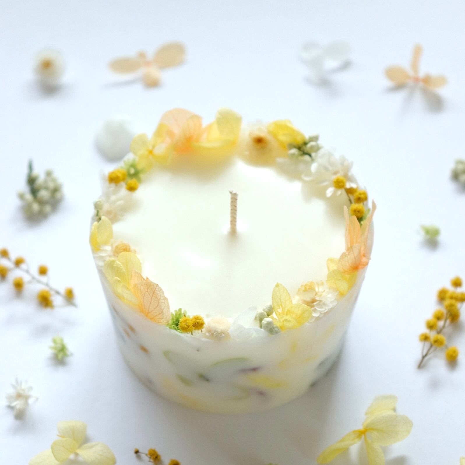 ソイキャンドルのオフホワイトと淡いイエローやオレンジのお花たちが可愛らしく咲いています。